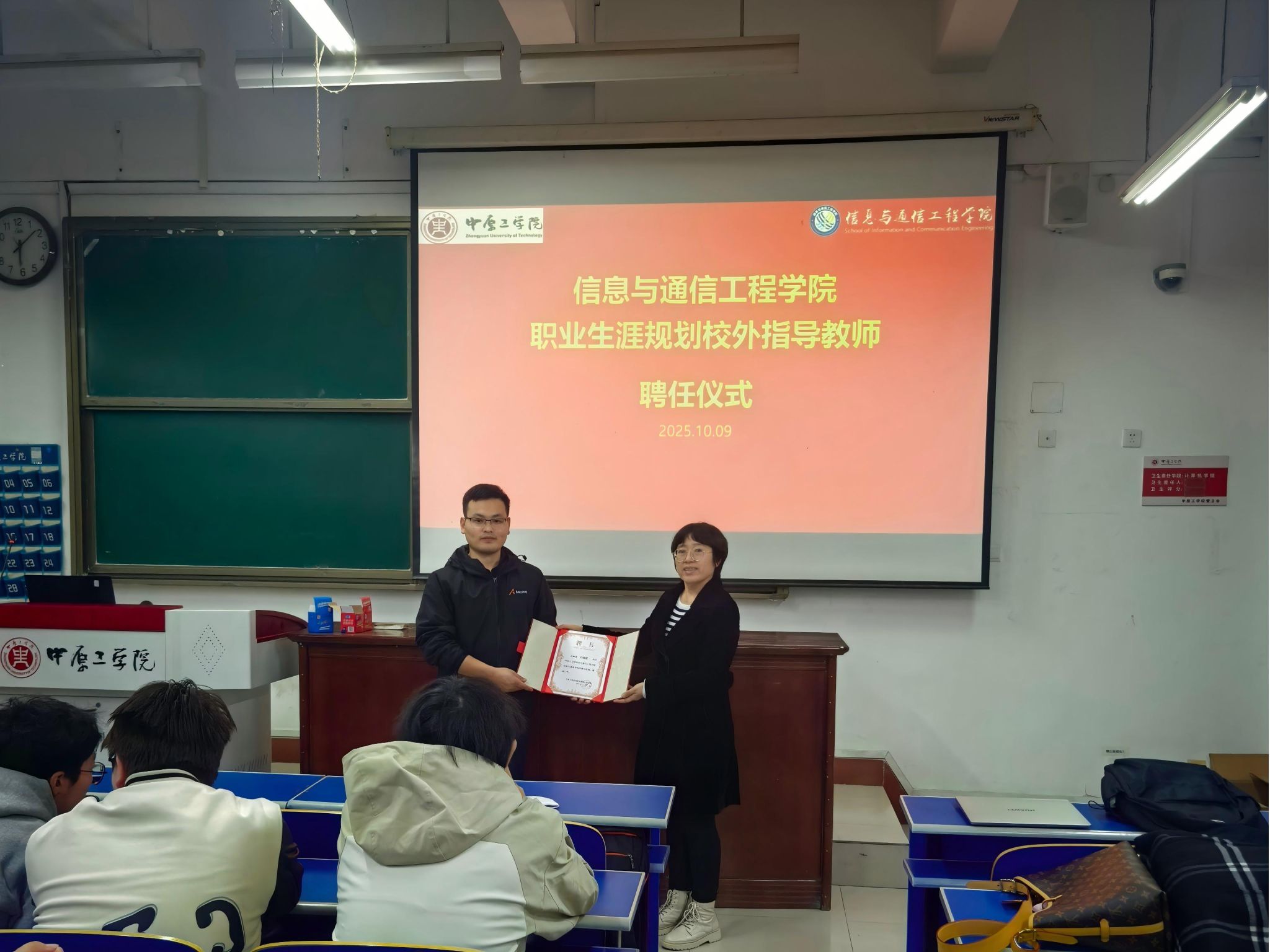 活动伊始,信通学院副院长张爱华为孙星星颁发 “职业生涯规划校外导师” 聘书。孙星星深耕通信技术与行业人才培养领域多年,具备丰富的实践经验与前沿视野。此次聘任旨在搭建校企协同育人桥梁,为学生职业发展提供更贴近行业需求的指导。